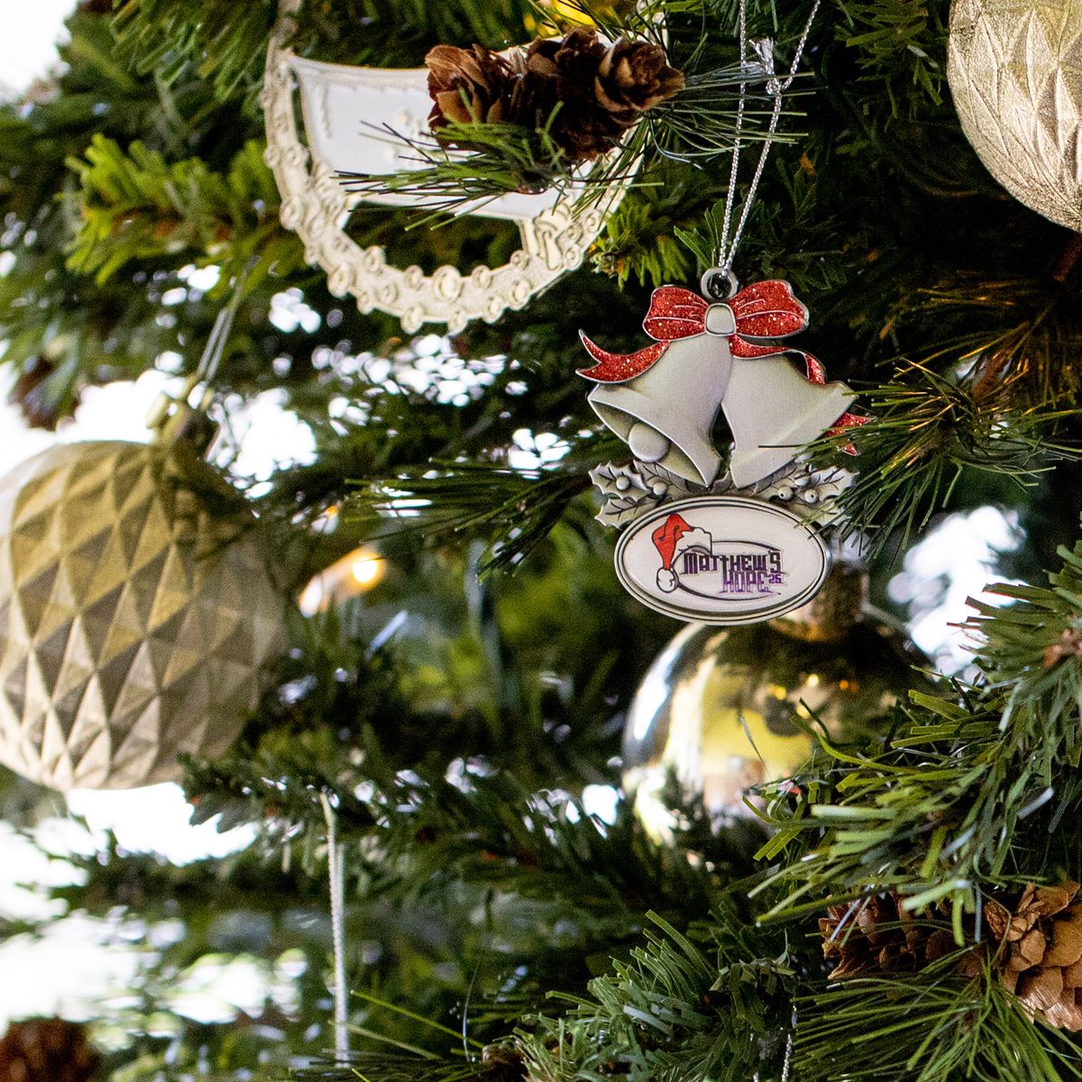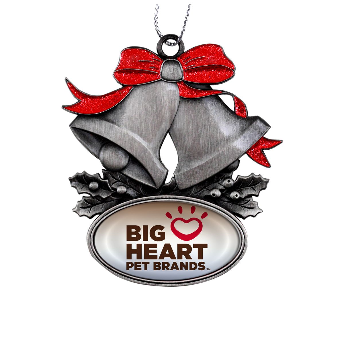 Ring in the holidays with this festive hanging ornament. This 2.5" holiday decoration is made of die cast alloy metal with a holiday bells, ribbon, holly and red glitter enamel motif with a large oval area to add your full color logo. Ornaments include a metallic hanging cord for